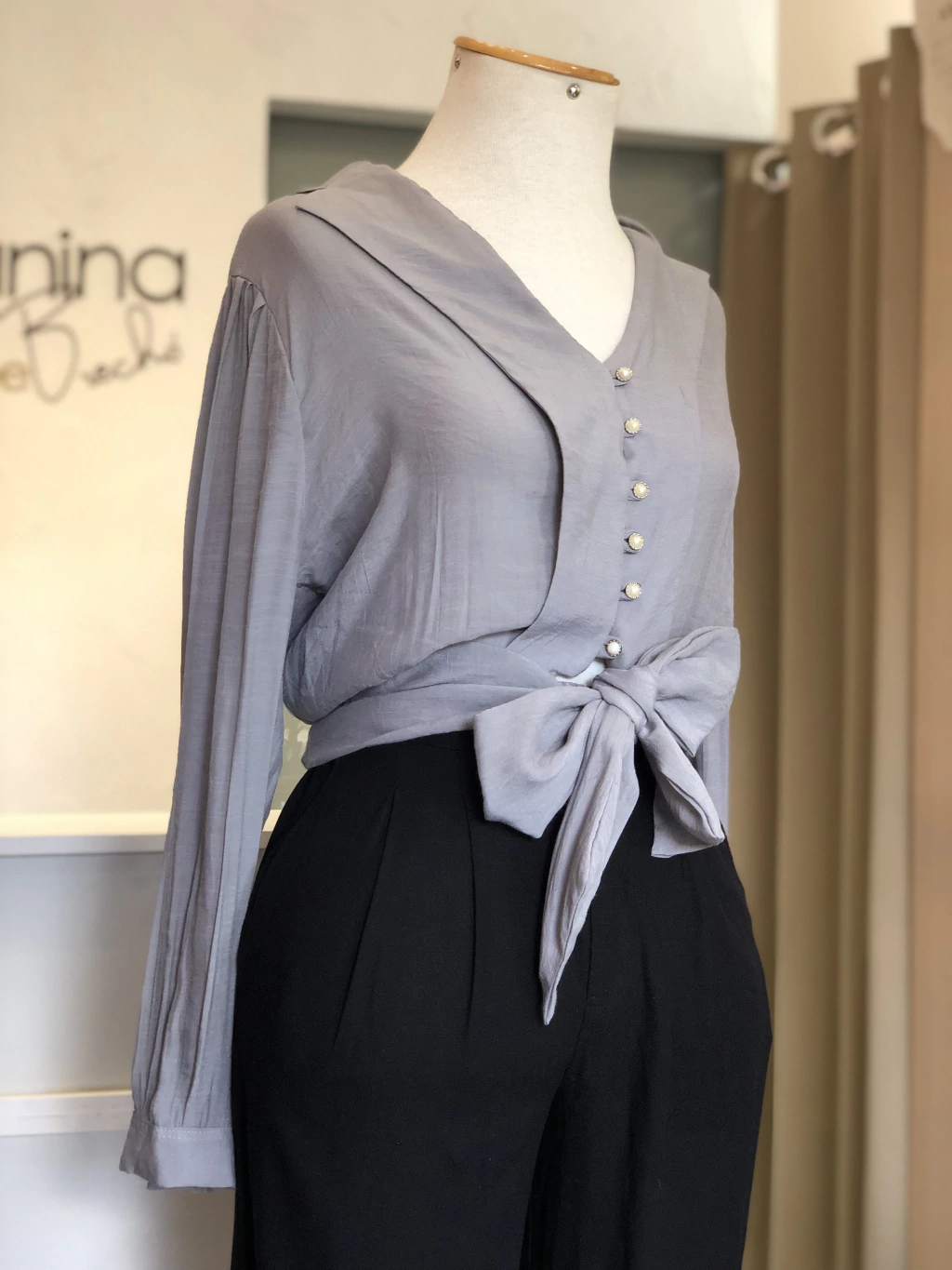 Blusa cropped romântica; cor cinza; botões perolados; amarração frontal; lastex trazeiro.