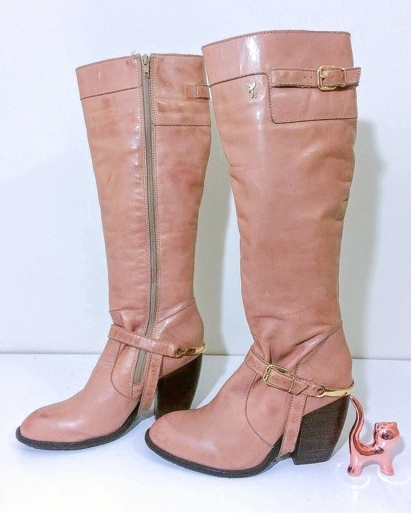 Descrição: bota rosê couro, estilo montaria; dealhes em fivela; cano alto; salto médio