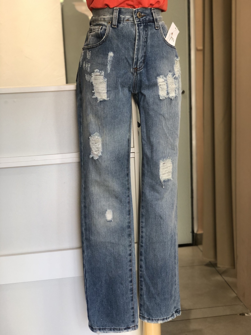 Calça jeans reta; com detalhes destroyed; bolsos laterais e trazeiros; zíper e botão. Material: 100% ALGODÃO