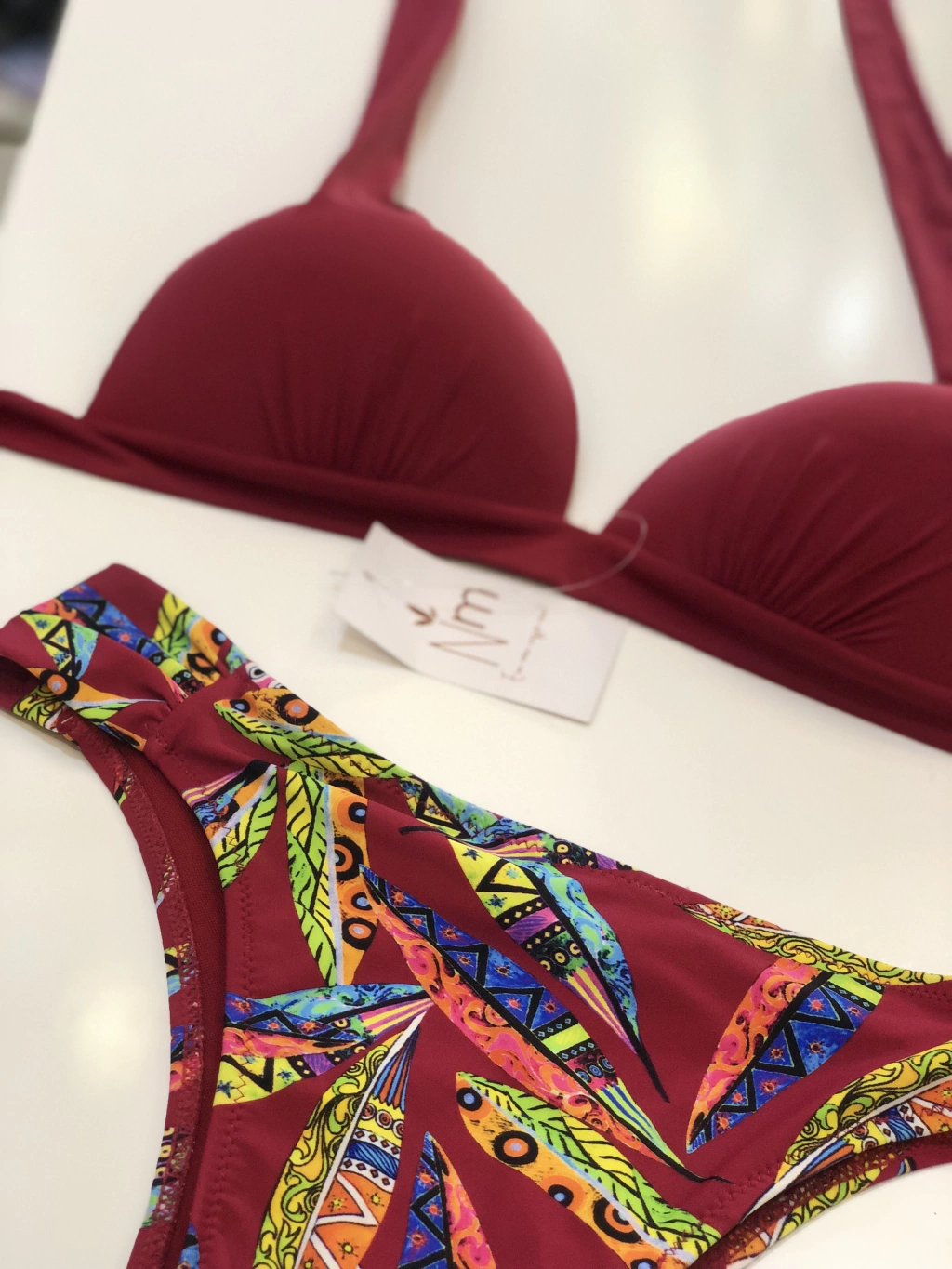 Top com bojo; calcinha estampada larga. Material: 88% POLIAMIDA; 12% ELASTANO
