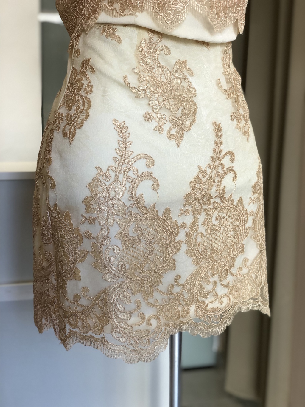 Conjunto cropped e saia dourados em renda guipir ; cropped decote canoa, mangas curtas, ambos com fechamento em zíper lateral