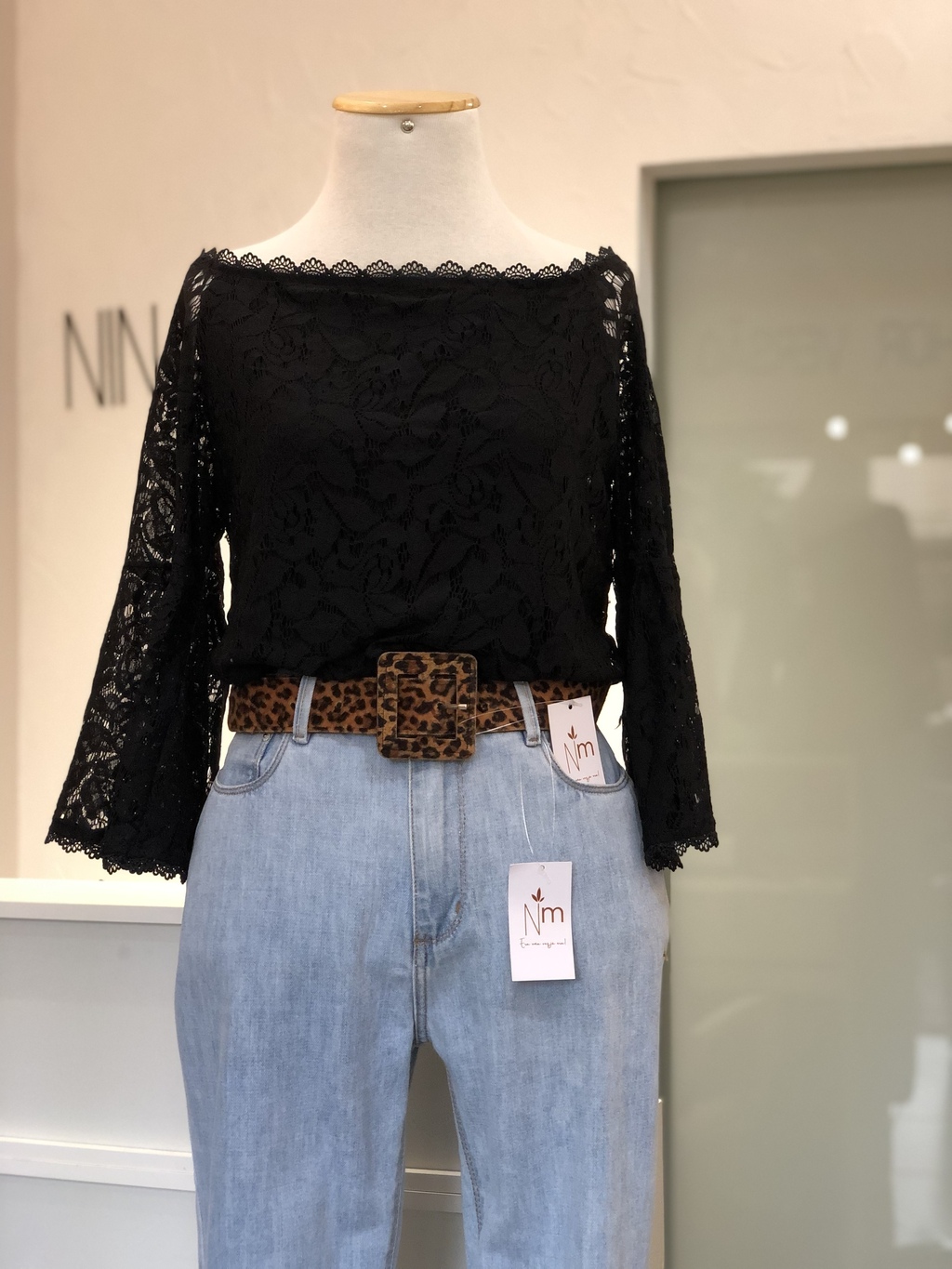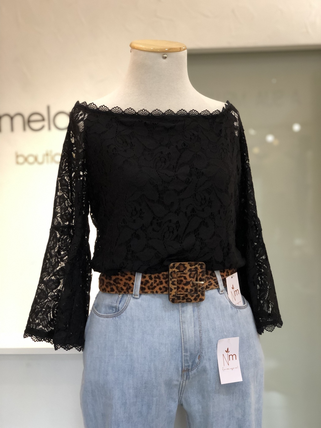 Cropped preto em renda; decote ombro a ombro; mangas 3/4 flare; elástico na barra.