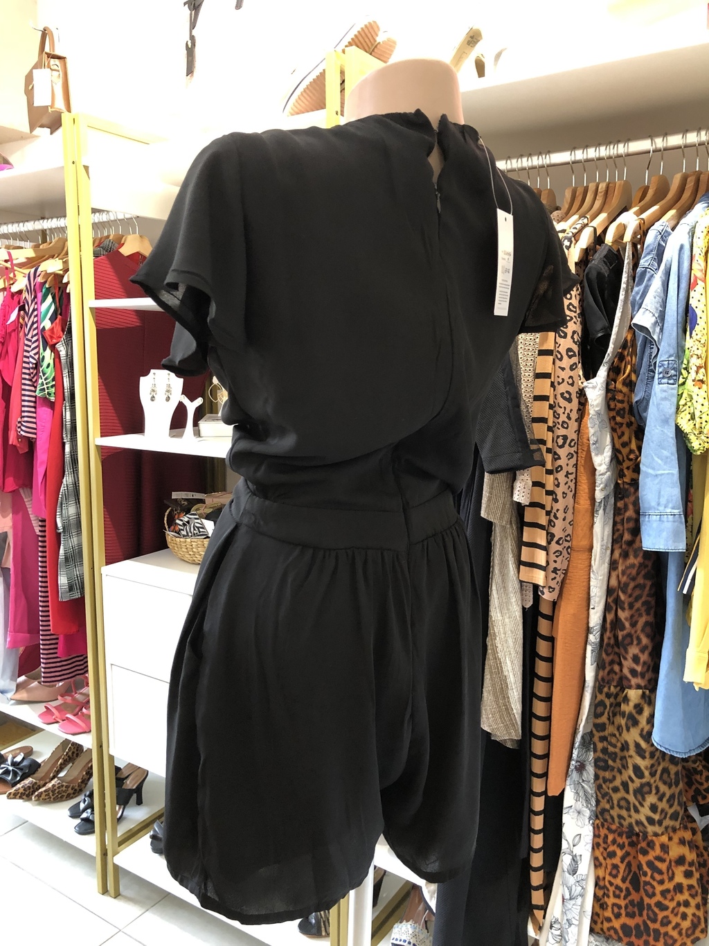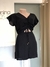Macaquinho preto drapeado frontal; fechamento em zíper trazeiro; com short forro; decote frontal; bolsos laterais.