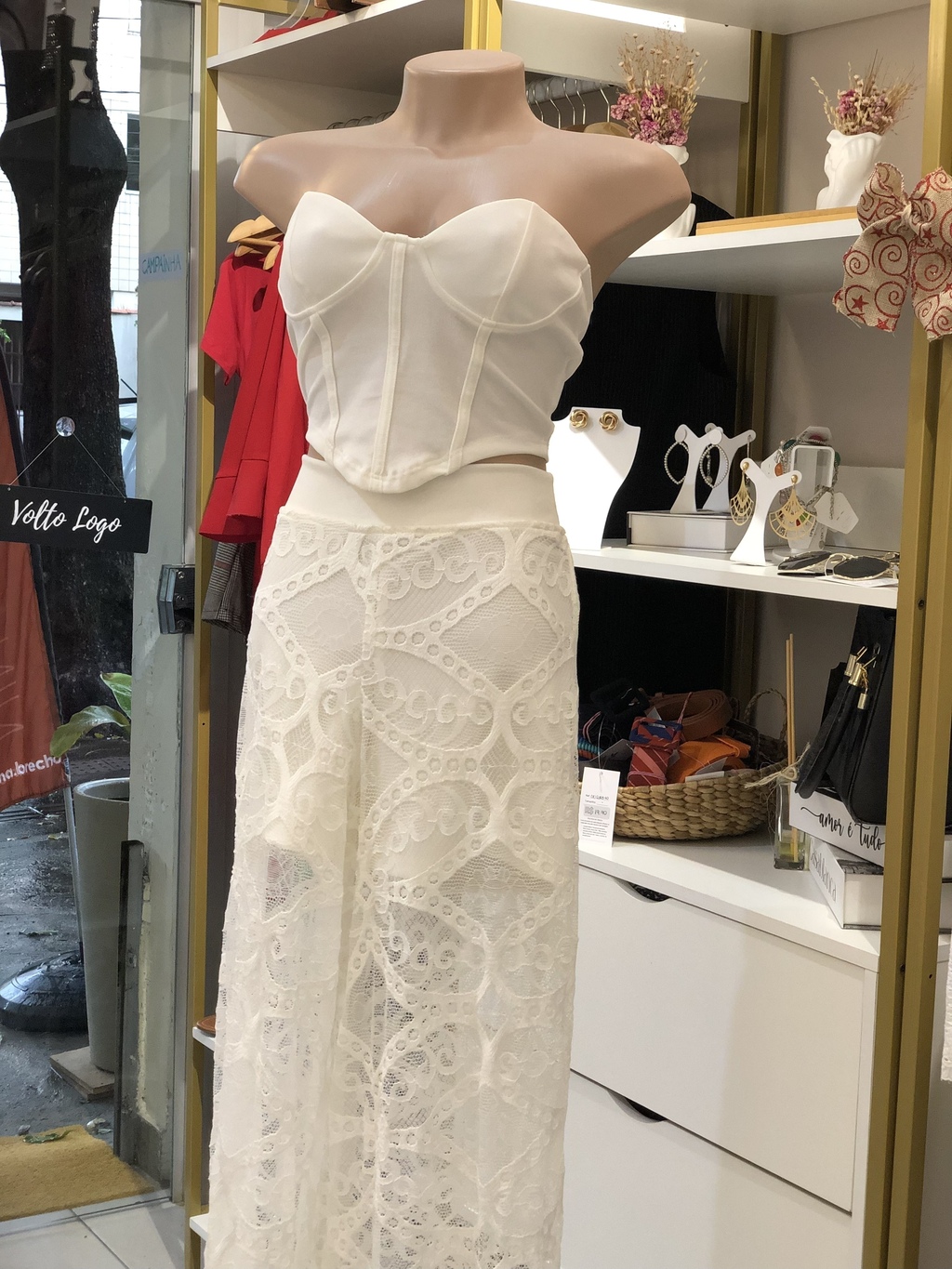 Calça modelagem pantalona; em renda; com short hot pants acoplado. Material: 90% POLIAMIDA; 10% ELASTANO