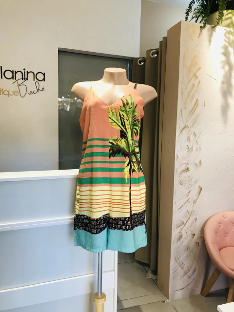 Macaquinho estampa tropical; com forro; alcinhas finas reguláveis; fechamento em zíper trazeiro. ♥Dica da Nina: etiqueta M, porém achei a forma pequena Ninas, sugiro tamanho P.