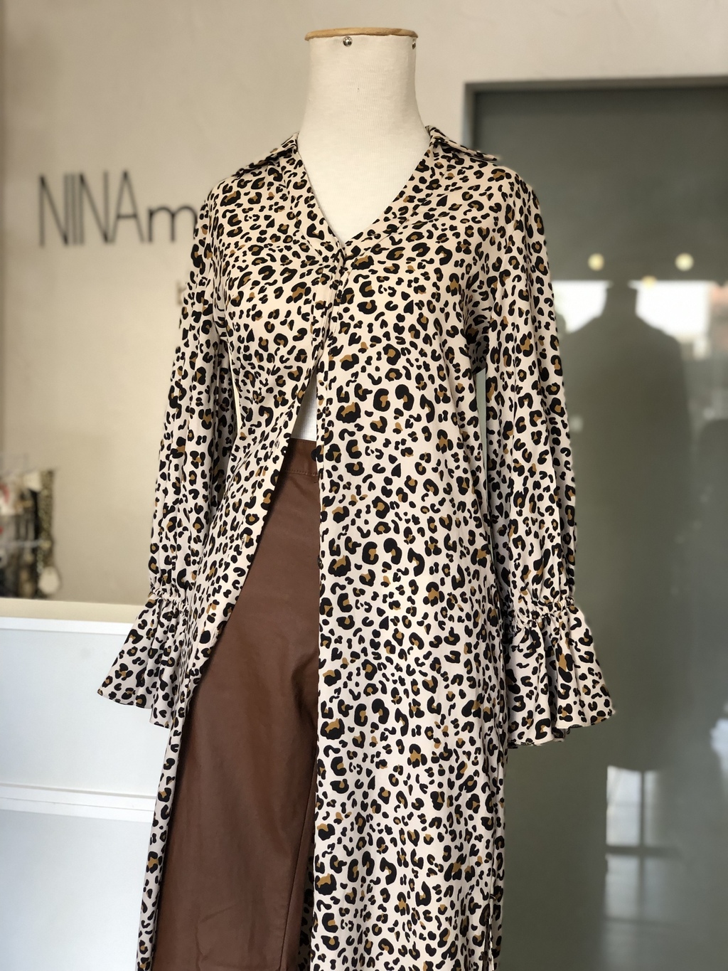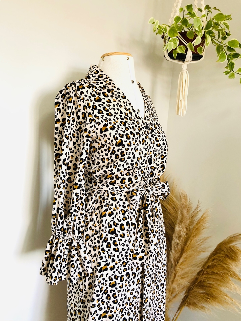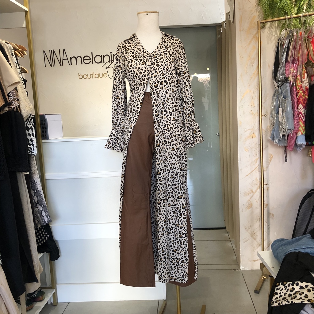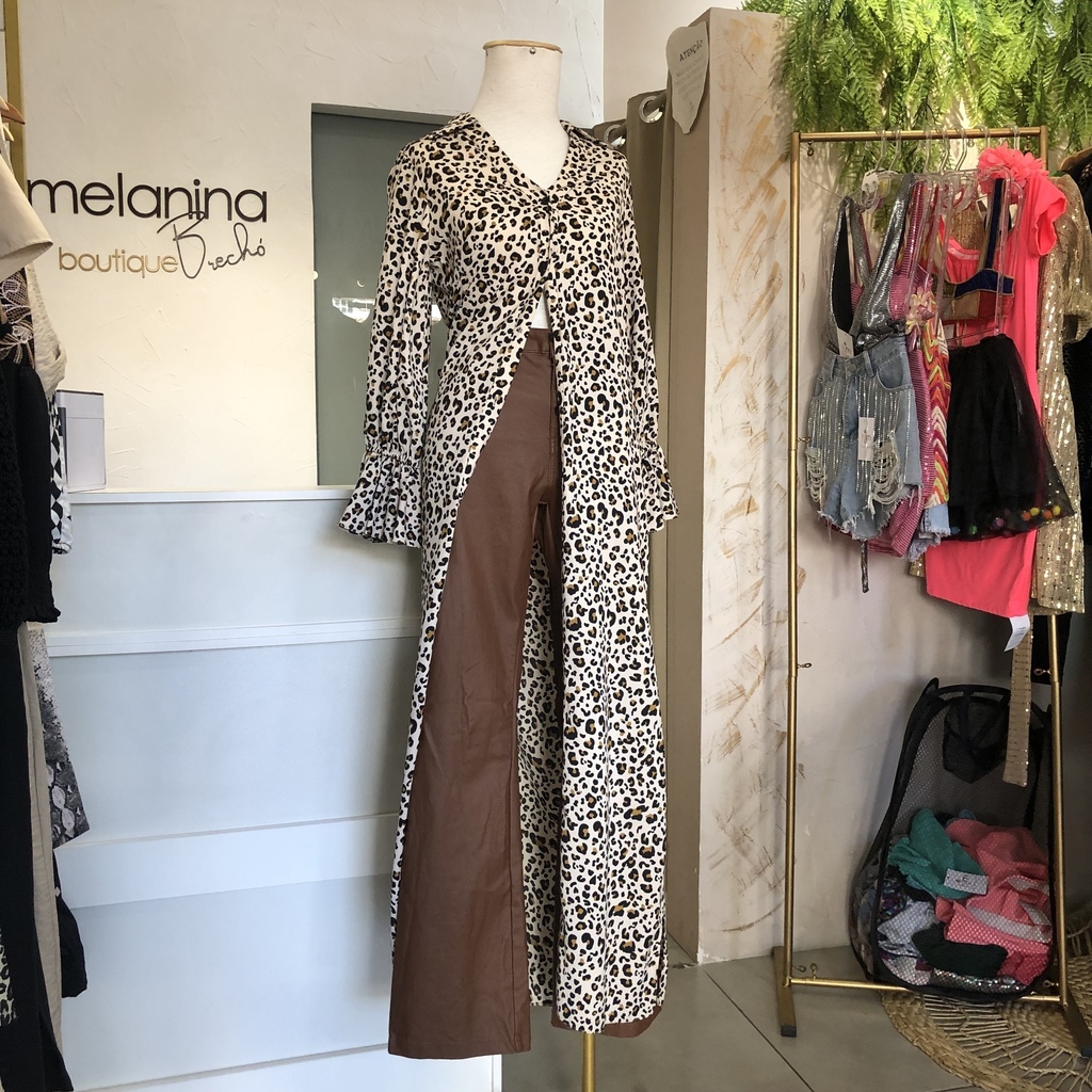 Vestido chemise longo; estampa animal print; babados nas mangas; abotoamento frontal; acompanha faixa. Material: 100% POLIÉSTER