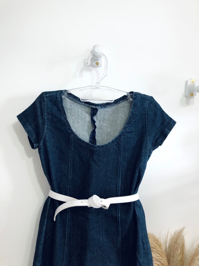Vestido casual jeans; lavagem escura; mangas curtas; decote canoa